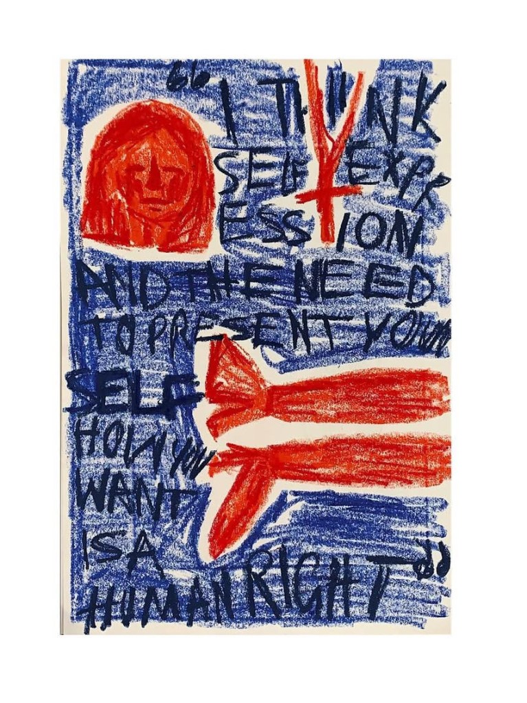 page out of my zine “what I’m enjoying at the moment” (click on me!)”I think self expression and the need to present yourself how you want is you want is a human right” OIL PASTEL PIECE